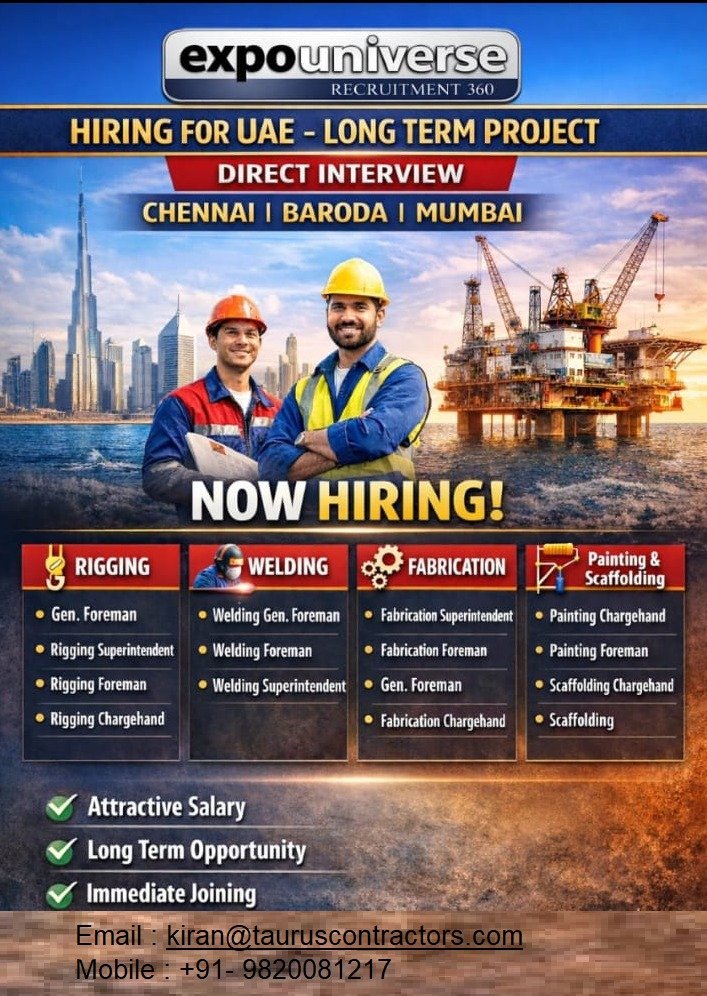 #UAEJobs #RiggingJobs #WeldingCareers #FabricationHiring #PaintingJobs #ScaffoldingJobs #ForemanJobs #LongTermProject #DirectInterview #ChennaiJobs #MumbaiJobs #BarodaJobs #OverseasJobs #Expouniverse #Recruitment360 #ImmediateJoining